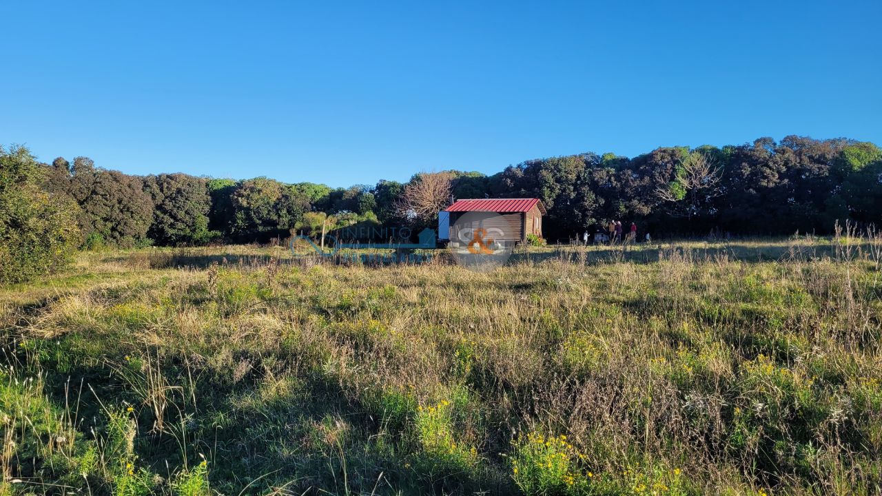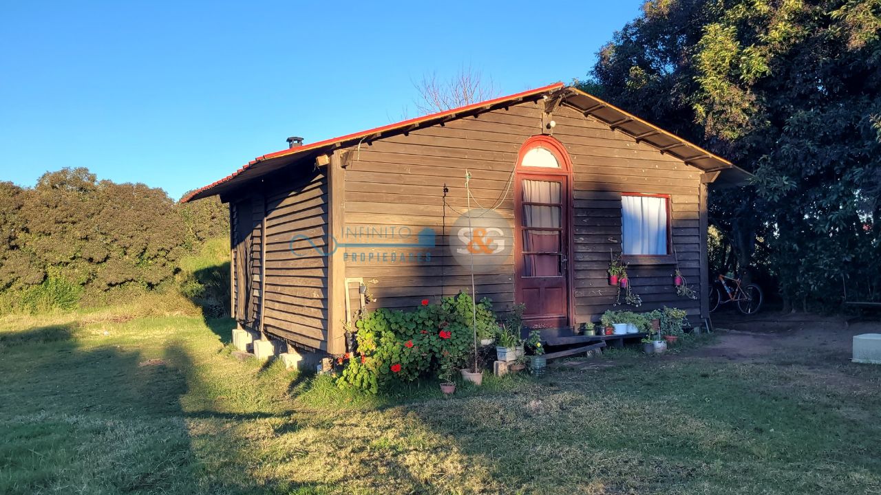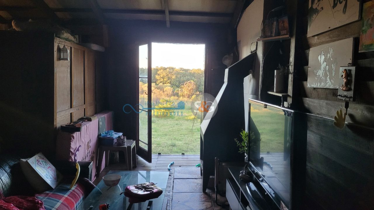 Terreno rural en venta, con cabaña de madera. Ubicado en Senda de Paso esquina Camino Manuel M. Flores, Paso de la Arena, Montevideo. La cabaña es un monoambiente con cocina integrada y estufa de leña. Rodeado de espesa vegetación de arboles.
